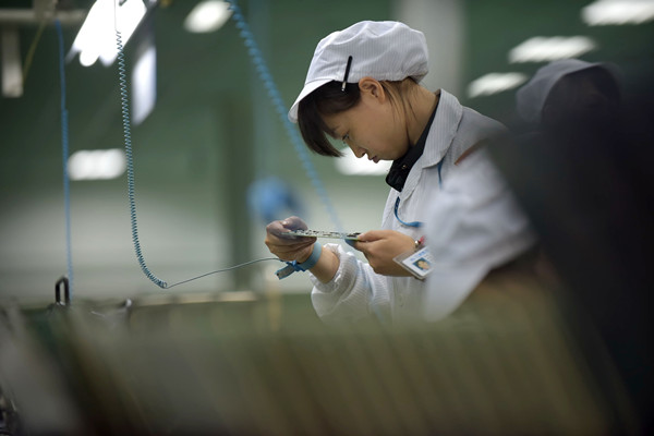 9月24日,在位于四川省綿陽市的四川九洲電子科技股份有限公司,工作人員正在對數字機頂盒印制板的電子元器件進行檢查。