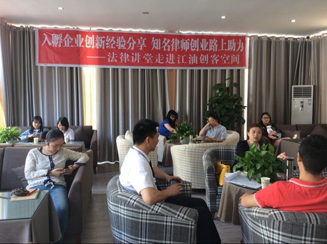 2016年5月18日,江油市創客空間攜太白律師事務所在創客咖啡舉行入孵企業法律知識講座及企業創新經驗的分享。參加本次講座的有綿陽悟空科技有限公司、江油弘云科技有限公司、綿陽煥然科技有限公司、江油歡喜小子網絡科技有限公司等十余家企業。
